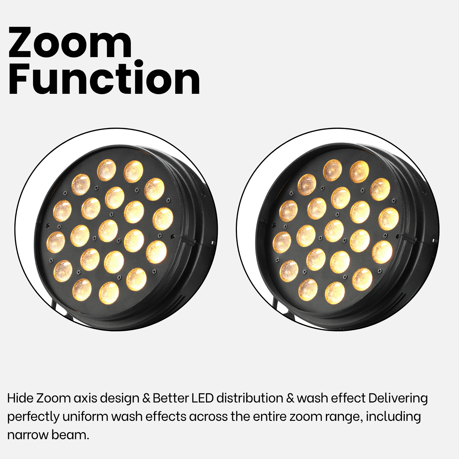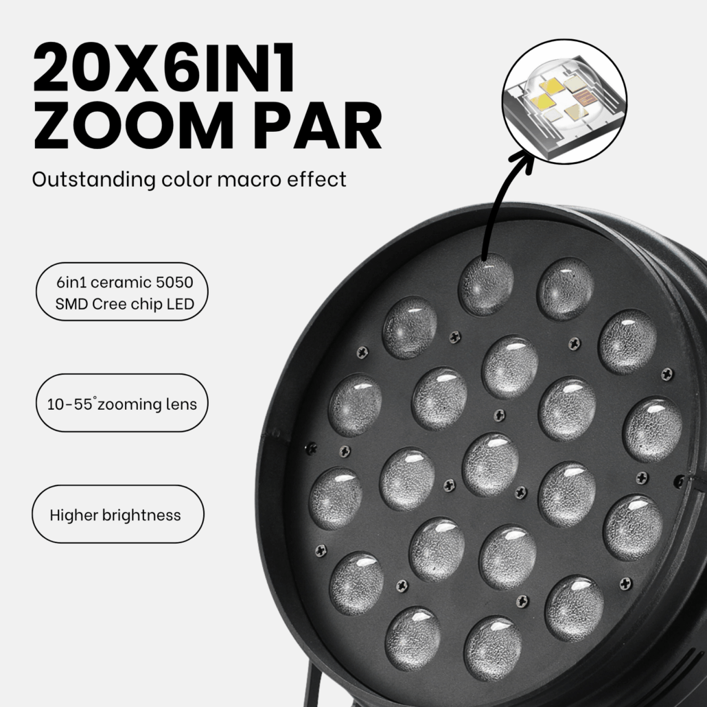- Light Data:Light source: 20pcs*6in1 Ceramic SMD 5050 Cree chip LED Optics:10-55°zooming lens