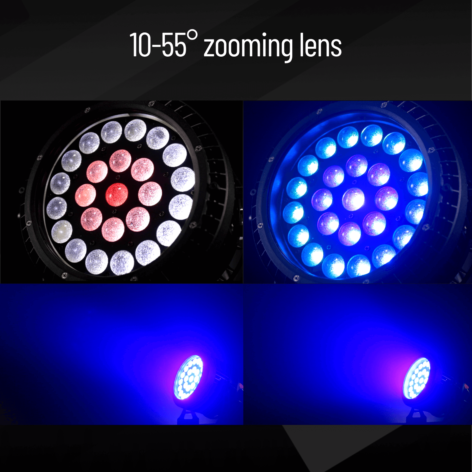 - Light Data:Light source: 25pcs*4in1 Ceramic SMD 5050 Cree chip LED Optics:10-55°zooming lens